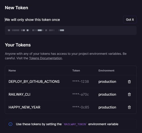 Railway とは Heroku のような PaaS です。 railway.app 結論 「トークン生成」→「CLI インストール」→「コマンド実行」の流れです。 1. トークン生成 Project Settings のページの Tokens のメニューに行き、New Token にてトークンを生成します。 トークン…